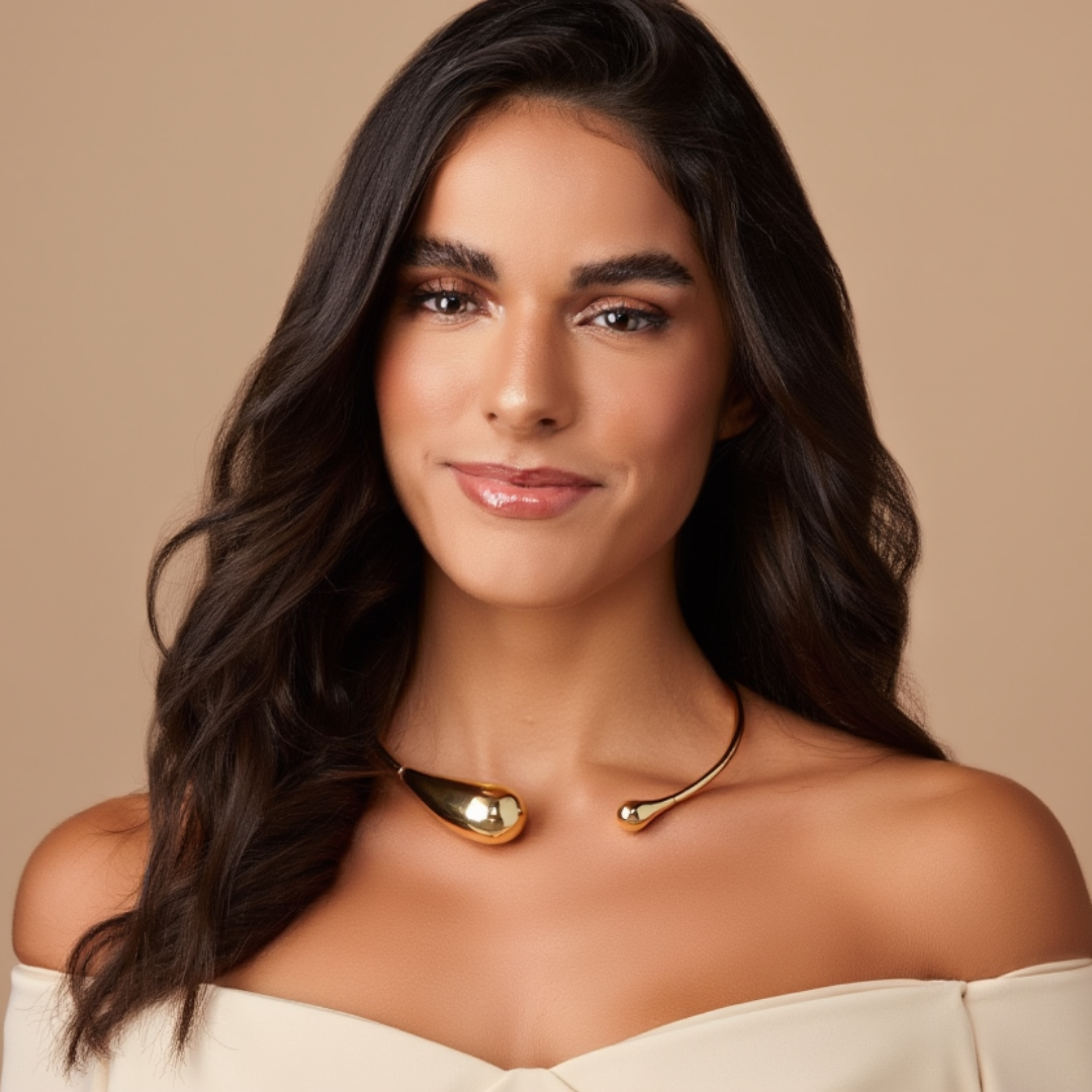 With its fluid teardrop silhouette and mirror-like metallic finish • this choker embodies the magnetic beauty of contrast — light and dark • soft and strong • refined yet unapologetically powerful.